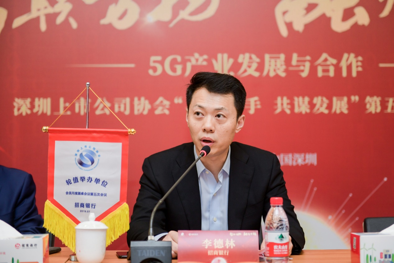 7月11日下午,由深圳上市公司協(xié)會牽頭、招商銀行股份有限公司主辦的“智聯(lián)萬物,融智有招——5G產(chǎn)業(yè)發(fā)展與合作”會員月度圓桌會議第五次會議在招商銀行深圳分行大廈3樓多功能廳成功舉行。深圳市證監(jiān)局處長梁文利、協(xié)會會長麥伯良、協(xié)會執(zhí)行副會長兼秘書長黃鐵軍、招商銀行總行行長助理李德林、總行董事會辦公室主任霍建軍等領(lǐng)導(dǎo)出席了本次活動,本次活動邀請了來自信息技術(shù)、制造、金融、地產(chǎn)等5 G行業(yè)的40家上市公司董事長、總經(jīng)理等60余人參加活動,行業(yè)專家齊聚一堂,共話5G發(fā)展浪潮中的機遇與挑戰(zhàn)。