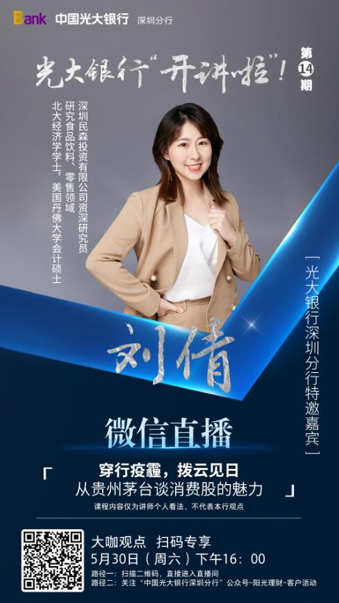 此次,光大銀行深圳分行攜手鳳凰深圳財經(jīng),邀請到北大經(jīng)濟學碩士、美國丹佛大學會計碩士、深圳民森投資有限公司資深研究員劉倩女士,在線為客戶帶來《穿行疫霾,拔云見日——從貴州茅臺看消費股的魅力》主題分享。據(jù)悉,劉倩女士關注于食品飲料、零售領域的投資研究。此次分享,她以眾所熟知的茅臺酒為案例,結合A股2000年至2018年漲幅數(shù)據(jù)、茅臺歷史、品牌發(fā)展、銷售渠道、市場占有等多方面,介紹孕育牛股搖籃的消費股投資邏輯,幫助更多客戶在全球受疫情沖擊、經(jīng)濟不確定時期,了解A股牛股市場邏輯、知曉投資策略提升個人資產(chǎn)。