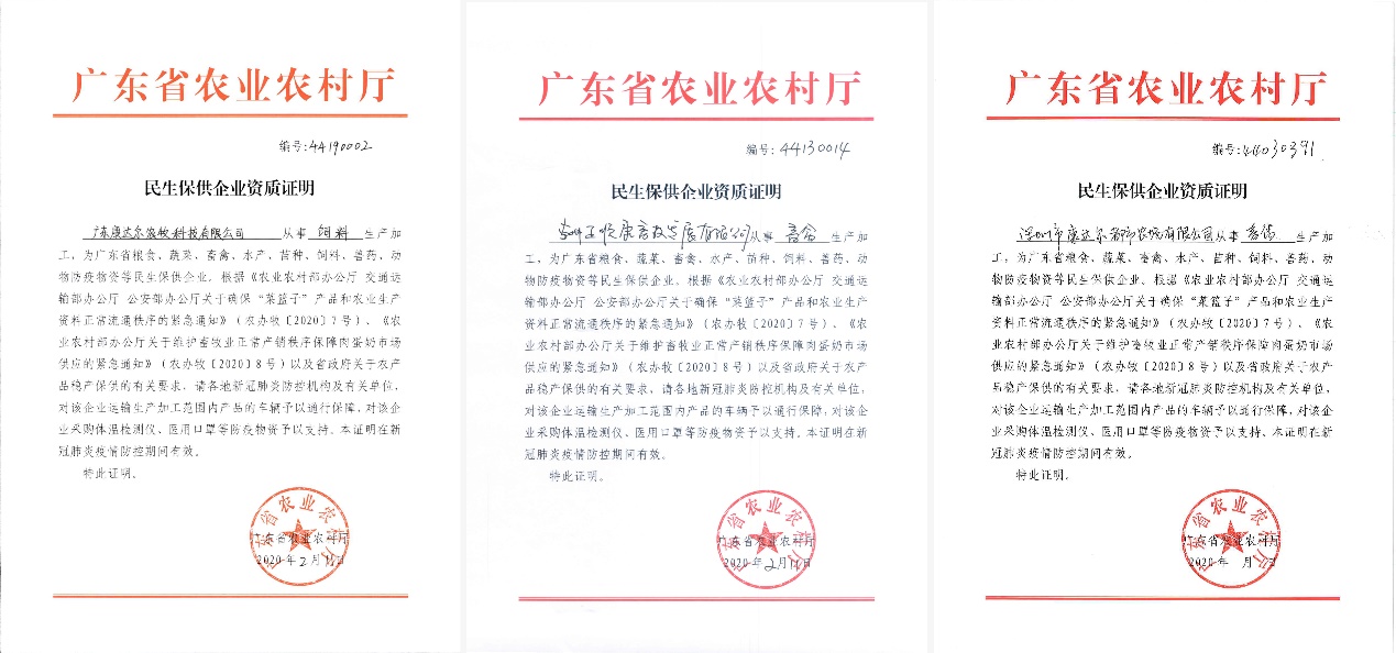 見圳客戶端·深圳新聞網(wǎng)2020年2月13日訊 農(nóng)產(chǎn)品是群眾生活必需品,農(nóng)業(yè)生產(chǎn)資料是農(nóng)業(yè)生產(chǎn)的必需物資。2020年2月11日-12日,康達(dá)爾集團(tuán)農(nóng)業(yè)板塊三大公司廣東康達(dá)爾農(nóng)牧科技有限公司、惠州正順康畜牧發(fā)展有限公司、深圳市康達(dá)爾都市農(nóng)場(chǎng)有限公司先后獲批“民生保供企業(yè)”資質(zhì)證明,這將非常有利于各企業(yè)開展農(nóng)產(chǎn)品和農(nóng)業(yè)生產(chǎn)資料的保供工作,也意味著康達(dá)爾集團(tuán)在這場(chǎng)防疫保供攻堅(jiān)戰(zhàn)中所發(fā)揮的作用獲得了高度的肯定。