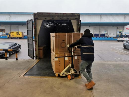 倉庫員工將如新中國捐贈(zèng)的400臺(tái)空氣凈化器出庫