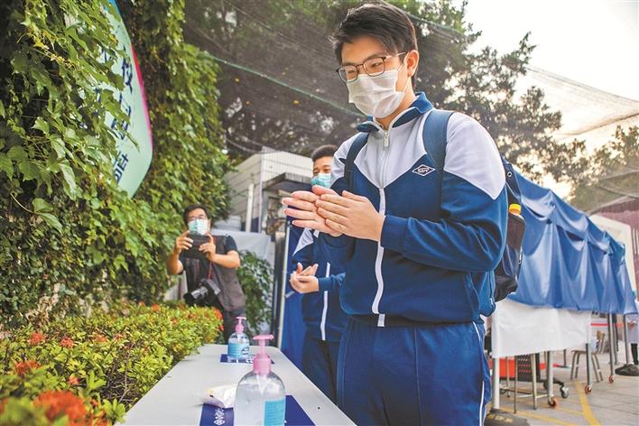 深圳實驗學校初中部初三學生進校門后自覺消毒洗手。晶報記者賴犁/攝