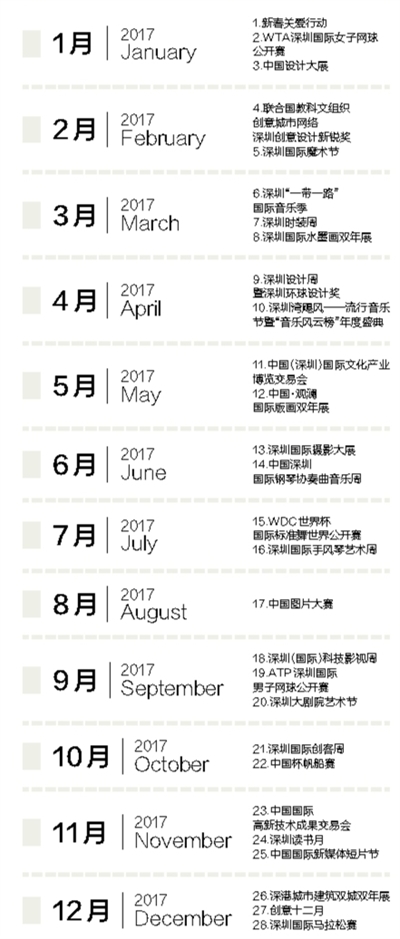 往細(xì)里說(shuō),“城市文化菜單”呈現(xiàn)出鮮明亮點(diǎn):一是國(guó)際化程度高。大部分活動(dòng)都有國(guó)際權(quán)威和國(guó)家級(jí)專業(yè)機(jī)構(gòu)主辦或授權(quán)支持,不少活動(dòng)代表了我國(guó)這一領(lǐng)域的最高水準(zhǔn),是可以代表深圳國(guó)際化城市形象的“文化大餐”。二是內(nèi)容豐富多彩。這份“菜單”表面上看只有28項(xiàng),實(shí)際上每項(xiàng)活動(dòng)時(shí)間跨度從幾天到一個(gè)多月不等,由十?dāng)?shù)項(xiàng)甚至上百項(xiàng)活動(dòng)組成,各款“菜式”都有,不同口味的人都可以自行“看單點(diǎn)菜”。三是體現(xiàn)深圳特色?!安藛巍敝杏腥种坏幕顒?dòng)與創(chuàng)新創(chuàng)意有關(guān),正好體現(xiàn)了深圳“創(chuàng)新之城”、“設(shè)計(jì)之都”的城市特性,可謂是深圳的文化“特產(chǎn)”。四是新的品牌活動(dòng)首次集體亮相。經(jīng)過(guò)多年培育,深圳已經(jīng)擁有文博會(huì)、高交會(huì)、讀書(shū)月、創(chuàng)意12月等傳統(tǒng)品牌活動(dòng),接下來(lái)還要精心打造一系列新的文化品牌活動(dòng)。在這份“菜單”中,2016年及今年新創(chuàng)辦的就有深圳“一帶一路”國(guó)際音樂(lè)季、深圳國(guó)際科技影視周、深圳國(guó)際攝影大展、深圳設(shè)計(jì)周、中國(guó)圖片大賽等多項(xiàng)活動(dòng),文博會(huì)、新春關(guān)愛(ài)行動(dòng)、國(guó)際魔術(shù)節(jié)等老牌活動(dòng)也都將有新的策劃、新的提升,更具國(guó)際化內(nèi)涵。一句話,這份菜單共匯集了國(guó)際化、標(biāo)志性的品牌文化活動(dòng)28項(xiàng),涵蓋文化藝術(shù)、創(chuàng)意設(shè)計(jì)、科技創(chuàng)新、體育休閑等多個(gè)類別,是廣義的文化活動(dòng)的概念。