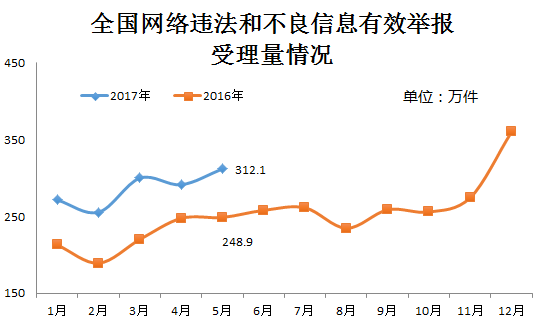5月份,各地網(wǎng)信辦各網(wǎng)站深入貫徹落實(shí)2017年全國(guó)網(wǎng)絡(luò)舉報(bào)工作會(huì)議暨第三批百家網(wǎng)站公布舉報(bào)受理方式會(huì)議精神,同時(shí)在“六一”國(guó)際兒童節(jié)到來(lái)前,進(jìn)一步加大對(duì)網(wǎng)上違法和不良信息,特別是淫穢色情等嚴(yán)重危害青少年身心健康有害信息的處置力度,受理違法和不良信息有效舉報(bào)312.1萬(wàn)件,環(huán)比、同比分別增長(zhǎng)約7.1%和25.4%。