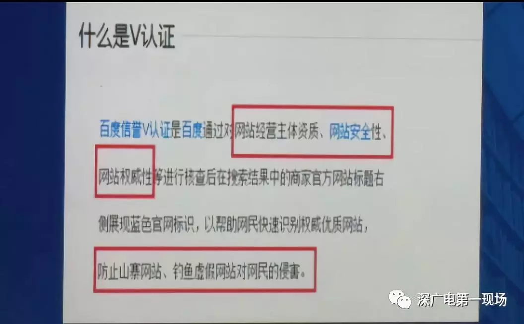 百度信譽(yù)V認(rèn)證對(duì)信譽(yù)值等級(jí)的界定是:信譽(yù)值V1:基礎(chǔ)信譽(yù)積累,可放心訪問(wèn);信譽(yù)值V2:良好信譽(yù)積累,可安心交易;信譽(yù)值V3:充分信譽(yù)積累,可持續(xù)信賴;百度信譽(yù)V認(rèn)證對(duì)所有網(wǎng)站加V認(rèn)證用戶如遇詐騙全額賠償。然而,深圳市消委會(huì)通過(guò)此次調(diào)查發(fā)現(xiàn),通過(guò)百度信譽(yù)V認(rèn)證的假冒品牌不在少數(shù)。