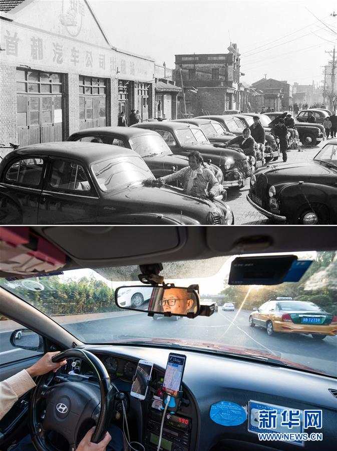 拼版照片:上圖為1965年,北京首都汽車公司職工在出租站擦洗汽車(新華社記者鄭震孫攝);下圖為2019年8月25日,北京新月聯(lián)合出租汽車公司司機(jī)穆懷東一邊運(yùn)送乘客,一邊通過網(wǎng)約車手機(jī)平臺(tái)接收訂單信息(新華社記者張笑宇攝)。