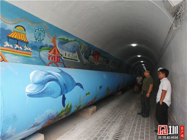 了解到這一情況后,南灣街道立即組織建設(shè)辦和樟樹(shù)布社區(qū)工作人員到現(xiàn)場(chǎng)實(shí)地察看、走訪,在征求居民們的意見(jiàn)后,決定對(duì)這條隧道進(jìn)行全面整治、涂鴉,并于今年9月進(jìn)場(chǎng)開(kāi)始重建、翻新該條隧道。該街道先后組織了施工隊(duì)員20余名,經(jīng)過(guò)40余天全封閉到半封閉的專(zhuān)業(yè)施工工作,先后完成路面鋪設(shè)、照明系統(tǒng)升級(jí)、安裝監(jiān)控設(shè)備、以及全面粉刷等,并進(jìn)行了全面涂鴉,內(nèi)容既有新中國(guó)的人文發(fā)展,也有栩栩如生的海洋動(dòng)物、化腐朽為神奇的山水畫(huà)等等,實(shí)現(xiàn)了隧道環(huán)境和“五彩繽紛美麗樟樹(shù)布”理念的和諧統(tǒng)一。該隧道已于今年10月底正式對(duì)周邊居民群眾開(kāi)放。