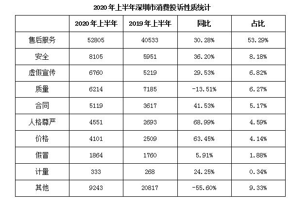根據(jù)《情況分析》,2020年上半年,深圳市消委會(huì)收到的消費(fèi)投訴問題性質(zhì)最多的為售后服務(wù),共52805宗,占比53.29%;其次為安全問題,共8105宗,占比8.18%;第三是虛假宣傳問題,共6760宗,占比6.82%。有關(guān)人格尊嚴(yán)問題、價(jià)格問題的投訴量與2019年相比均同比上漲超過60%;有關(guān)質(zhì)量問題的投訴量與2019年相比均有所下降。