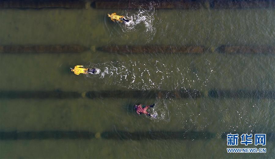10月22日,樂亭縣姜各莊鎮(zhèn)二節(jié)村海參養(yǎng)殖基地的工人在捕撈海參(無人機(jī)拍攝)。 時下,正值渤海灣地區(qū)海參收獲時節(jié),河北省樂亭縣的海參養(yǎng)殖戶忙著捕撈海參,供應(yīng)各地市場。據(jù)介紹,該縣海域水質(zhì)優(yōu)良、氣候適宜,是海參養(yǎng)殖的理想場地,目前發(fā)展池塘造礁養(yǎng)殖海參面積6萬畝,年產(chǎn)鮮活海參6000多噸,年產(chǎn)值2億多元。 新華社記者 楊世堯 攝