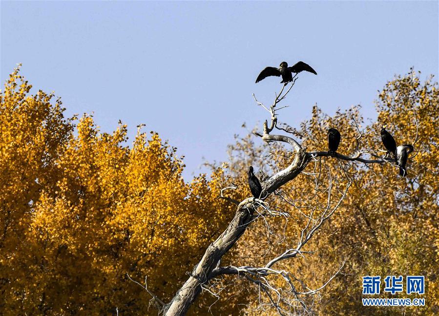在位于新疆巴音郭楞蒙古自治州輪臺(tái)縣的一處胡楊林里,鳥(niǎo)兒站在胡楊枝頭上(10月25日攝)。