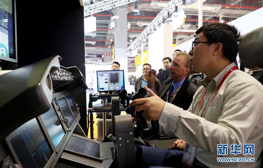11月5日,一名參觀者在美國波音公司展臺體驗787機型的模擬駕駛艙。 新華社記者 方喆 攝