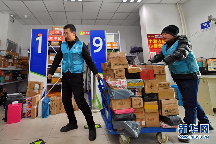 在山西省太原市富士康科技工業(yè)園的一家快遞驛站里,站長張新(左)在搬運(yùn)快遞(1月15日攝)。