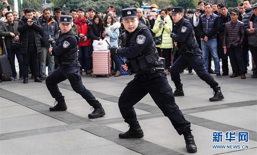 1月16日,旅客在觀看民警技能演練。 當(dāng)日,武漢鐵路公安處在漢口火車站舉行警營開放日活動,讓旅客零距離接觸警務(wù)安全工作,營造良好的春運出行環(huán)境。 新華社記者程敏攝