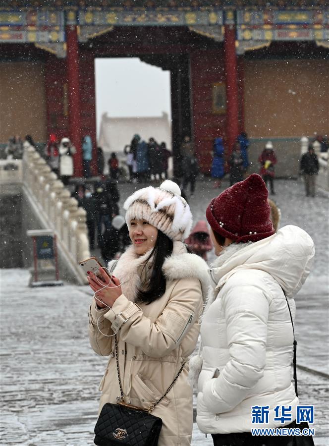 2月14日,游客在雪中游覽北京故宮。 當日,北京降雪,大批游人來到故宮游覽賞雪。 新華社記者 金良快 攝