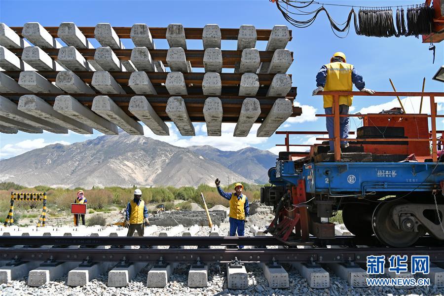 6月6日,負責鋪軌的中鐵十一局集團的建設者在現場作業(yè)。新華社記者普布扎西攝
