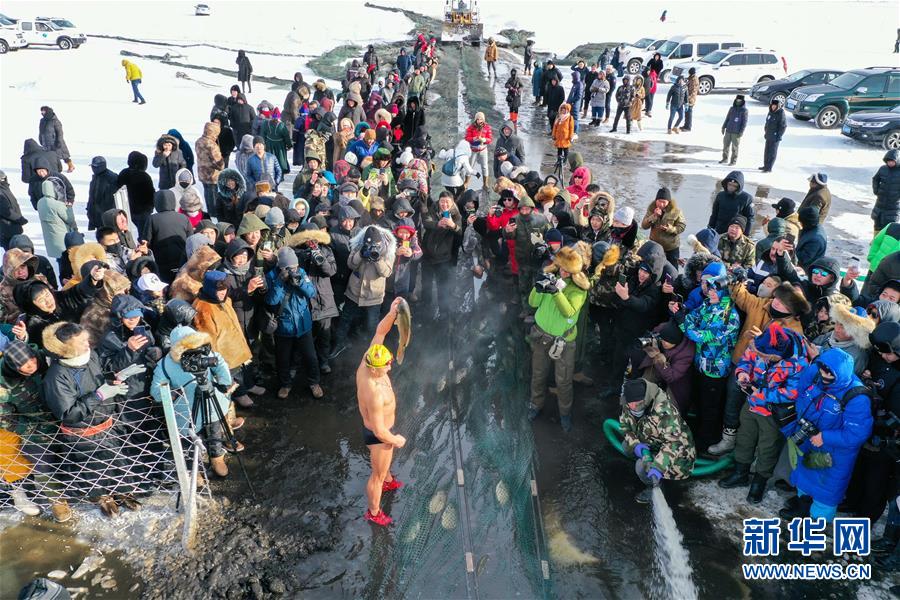 12月18日,一名冬泳愛好者展示冬捕魚(無人機拍攝)。 當日,位于內(nèi)蒙古呼倫貝爾大草原上的諾干湖舉行冬捕活動,吸引不少游客前來觀看。冬日的諾干湖冰雪覆蓋,諾干湖冬捕也是當?shù)囟韭糜蔚奶厣顒又弧?新華社記者 劉磊 攝