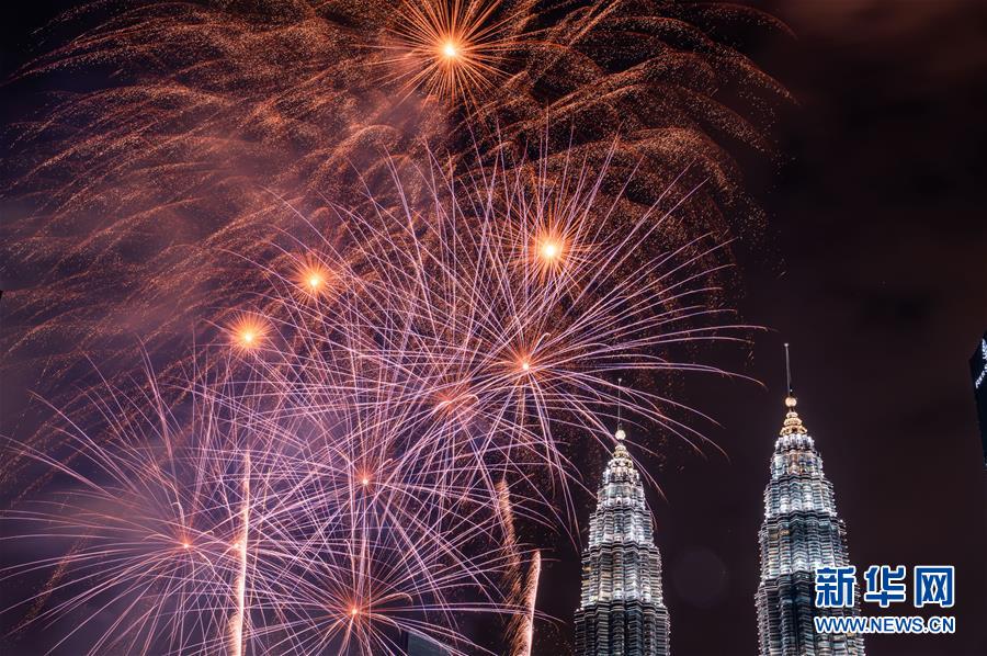 2020年1月1日,焰火在馬來西亞吉隆坡的馬來西亞國(guó)家石油公司雙塔旁綻放,迎接新年的到來。新華社記者朱煒攝