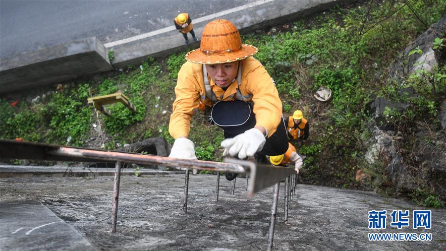 1月14日,百色工務(wù)段白水河橋隧工區(qū)班組成員攀梯上山開展巡查工作。在中國鐵路南寧局集團公司百色工務(wù)段白水河橋隧工區(qū),有一個由14名工人組成的班組。他們常年像“爬山虎”一樣行走攀爬在地形險峻、云霧繚繞的高山上,負(fù)責(zé)南昆鐵路轄區(qū)路段的搜山掃石工作,清除一切可能危害鐵路行車安全的因素,保障旅客出行安全。新華社記者張愛林?jǐn)z