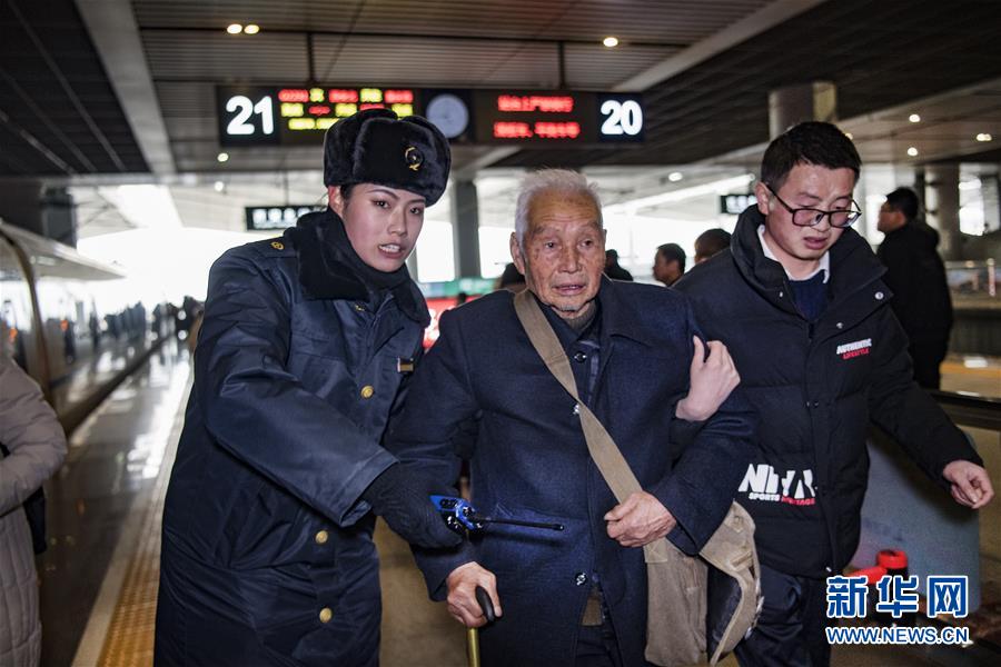 盲人姑娘吳瀟(左)從西安北站中轉(zhuǎn)回延安老家,得到吉如的溫馨服務(wù)。臨別時,吳瀟激動地說:“小姐姐,你的服務(wù)太貼心了,我看不見你,能摸摸你的臉頰嗎?”(1月15日攝)。新華社記者陶明攝