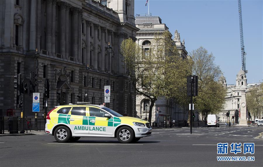 4月14日,在英國(guó)倫敦,一輛救護(hù)車從議會(huì)街前駛過。新華社記者韓巖攝