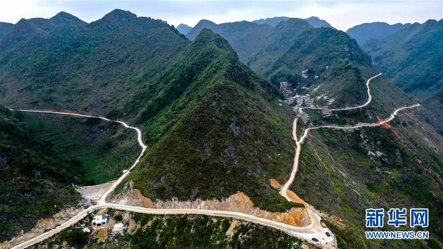 這是在進(jìn)行路面硬化的大化瑤族自治縣七百弄鄉(xiāng)弄合村弄魯屯到弄確屯的屯級路(5月14日攝,無人機照片)。新華社記者曹祎銘攝
