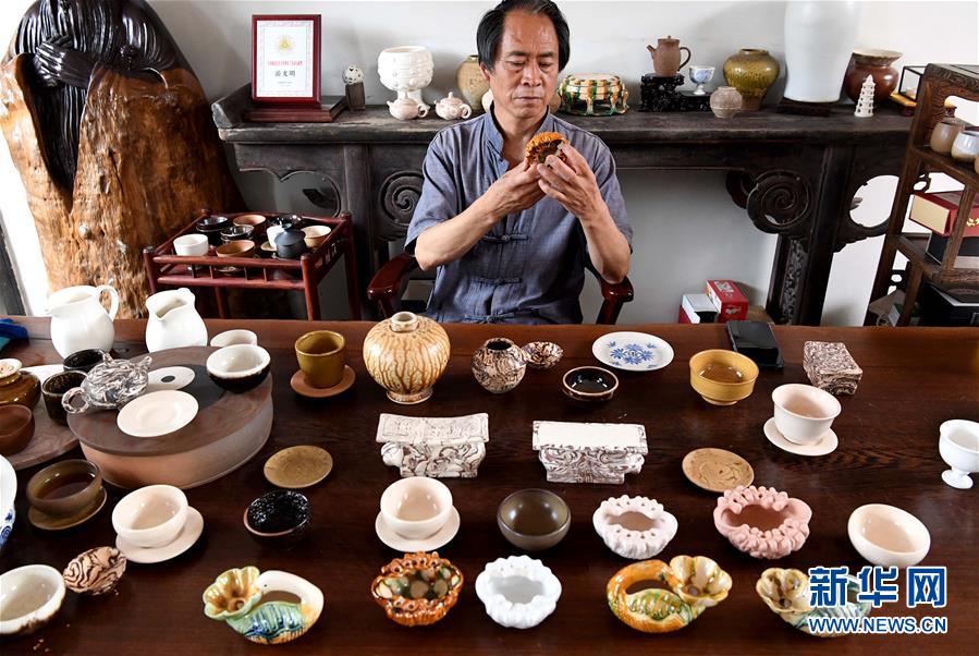 在河南省鞏義市站街鎮(zhèn)小黃冶村的工作室里,游光明在查看他燒制的“三彩雕花杯”(6月19日攝)。