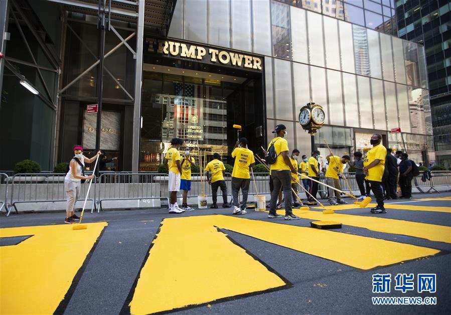 7月9日,在美國(guó)紐約第五大道特朗普大廈前,人們涂寫“黑人的命也是命”標(biāo)語(yǔ)。當(dāng)天,數(shù)十人在紐約第五大道特朗普大廈前的路面上涂寫“黑人的命也是命”標(biāo)語(yǔ)。紐約市計(jì)劃在多處地點(diǎn)涂寫“黑人的命也是命”標(biāo)語(yǔ)。新華社記者王迎攝