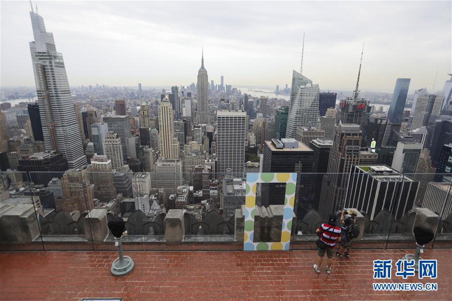 8月6日,在美國紐約,人們在洛克菲勒中心觀景臺上觀看城市景觀。當(dāng)日,3月份暫時關(guān)閉的洛克菲勒中心觀景臺恢復(fù)對公眾開放。每天13時至21時,人們可戴口罩前往參觀。新華社記者王迎攝