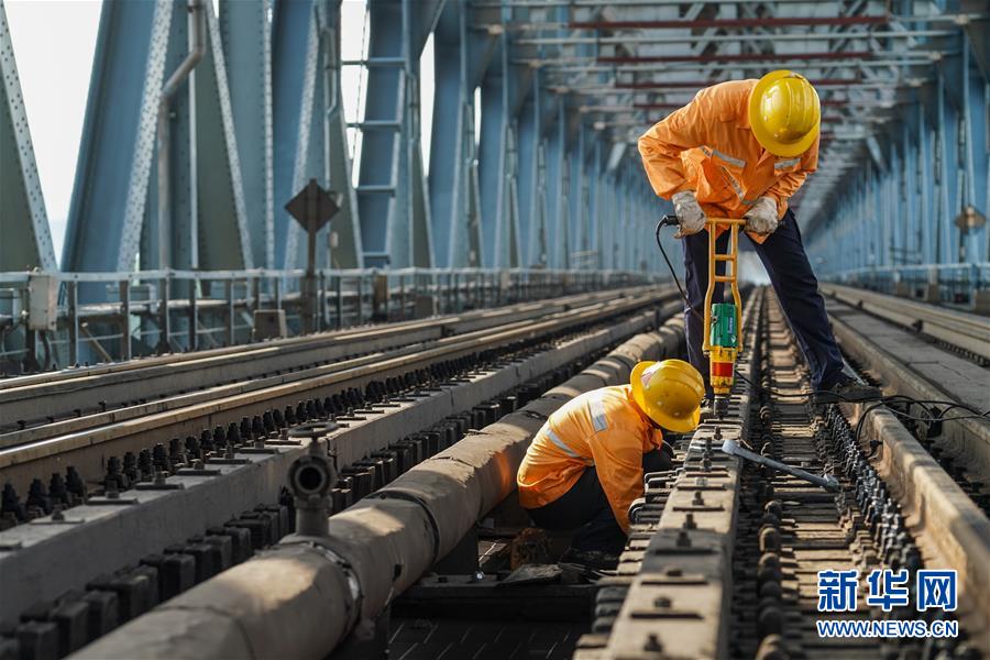 8月6日,兩名橋隧工在南京長江大橋作業(yè)點擰緊螺帽,固定護木。新華社記者李博攝
