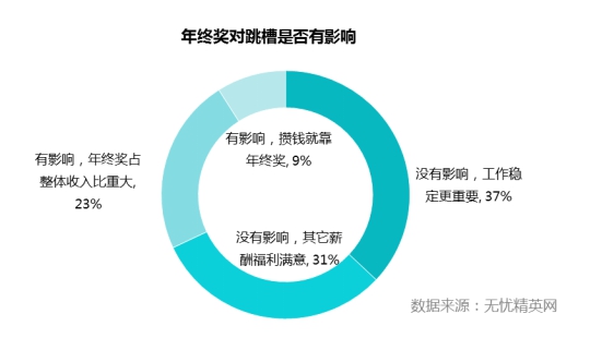 但是即便大部分人對今年的年終獎的增長沒有信心,卻很難讓他們因為年終獎而跳槽。半數(shù)以上的受訪者年終獎占全年收入的比例僅為20%左右,即便不滿意年終獎,但工作的穩(wěn)定性、工作環(huán)境、企業(yè)福利是他們更看重的要素。有3成受訪者表示收入依賴年終獎,如果年終獎不滿意一定會尋找機會跳槽。因此企業(yè)在人才管理上,需要特別注意年終獎對于員工保留的影響,提前做好預防工作。