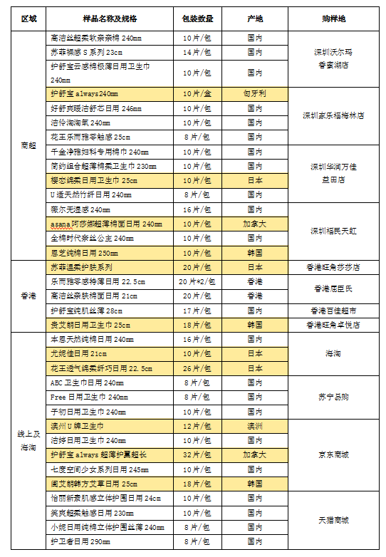 據(jù)前期調(diào)研發(fā)現(xiàn),國(guó)外品牌衛(wèi)生巾更受女性消費(fèi)者青睞,很多消費(fèi)者認(rèn)為國(guó)外品牌衛(wèi)生巾質(zhì)量更優(yōu)更值得信賴,進(jìn)而選擇跨境或海淘等方式購(gòu)買國(guó)外產(chǎn)品。因此,本次樣品分別從深圳商超、香港、線上海淘購(gòu)買樣品進(jìn)行測(cè)試和比較,樣品涉及11款國(guó)外原裝產(chǎn)品。詳見下表。