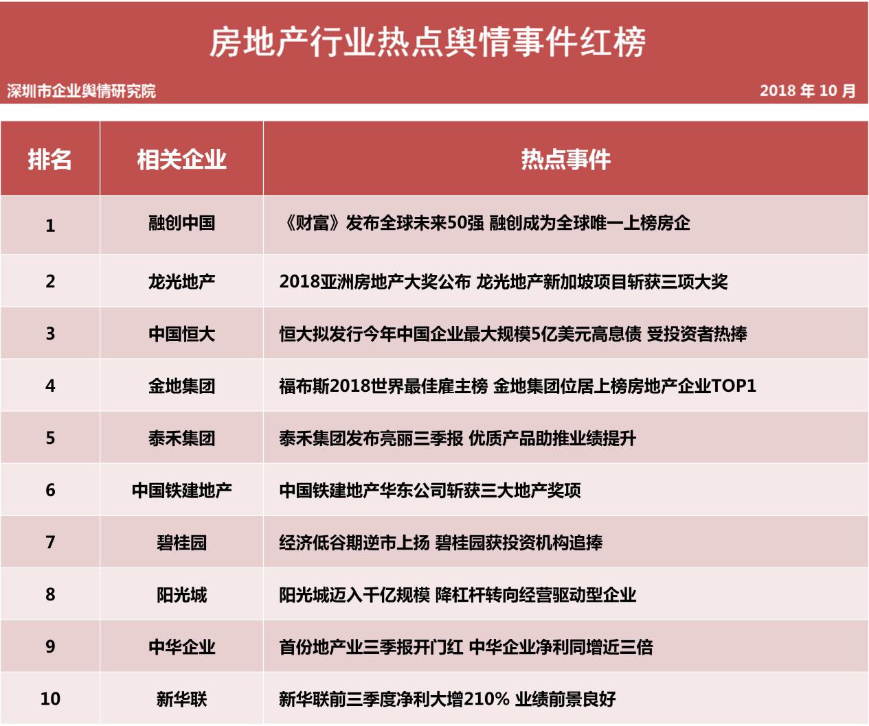 本榜單主要通過計算機(jī)系統(tǒng)對輿情數(shù)據(jù)的自動采集、整理和分析,結(jié)合輿情分析師的篩選和研判,對2018年10月1日至10月31日這一時段內(nèi)房地產(chǎn)領(lǐng)域的熱點(diǎn)輿情事件作出綜合評估,主要評估指標(biāo)包含新聞報道指數(shù)、微博擴(kuò)散指數(shù)、論壇參與指數(shù)、境外炒作指數(shù)。