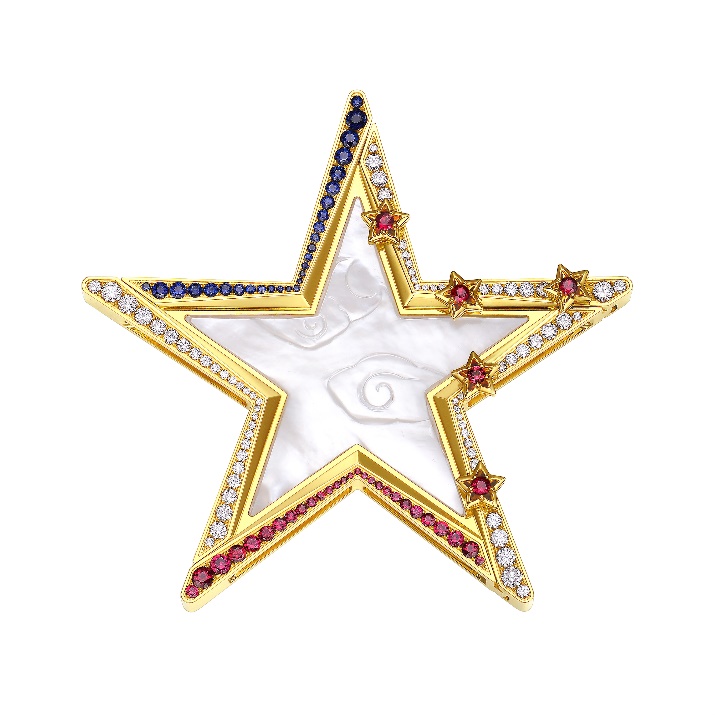 作為本次發(fā)布會主角,周大福17916系列新品“宸”曾作為第11屆“法國圣埃蒂安國際設(shè)計(jì)雙年展”參展作品,在世界舞臺上綻放過光芒?!拔褰切恰钡脑煨腿谌肓朔▏鴩焖{(lán)、白、紅三色和中國國旗的五角星元素,代表了中法兩國的交流與合作,雙方希望通過宸這樣意義深遠(yuǎn)的產(chǎn)品,見證和促進(jìn)兩國的和平發(fā)展與經(jīng)濟(jì)交流?!板贰币员睒O星為靈感來源,寓意點(diǎn)亮年輕人的生活與夢想。別具一格的五角星設(shè)計(jì)藝術(shù)感十足,鉆石與22K金的加持,更讓整個(gè)作品展現(xiàn)出奪目光彩。白貝母項(xiàng)鏈外圈圍以鉆石、寶石,一款三戴,幻化無限魅力。簡潔的五角星造型,干凈有力,猶如夜空中指引前行的明星。