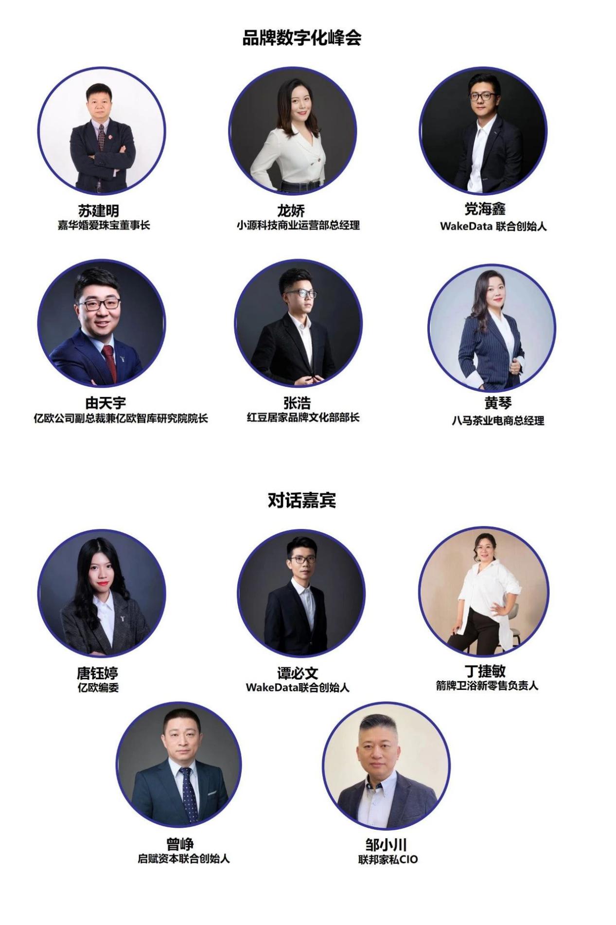 10月30日14:00—17:00(宴會廳Ⅱ)舉行品牌數(shù)字化峰會,由嘉華婚愛珠寶董事長蘇建明主持。小源科技商業(yè)運(yùn)營部總經(jīng)理龍嬌演講主題《企業(yè)AI場景化服務(wù)之道》 WakeData聯(lián)合創(chuàng)始人黨海鑫演講主題《喚醒數(shù)據(jù)讓企業(yè)更懂自己的用戶》,億歐公司副總裁兼億歐智庫研究院院長由天宇演講主題《品牌的技術(shù)創(chuàng)新與潮流變革》,紅豆居家品牌文化部部長張浩演講主題《基于用戶的品牌數(shù)字化升級》,八馬茶業(yè)電商總經(jīng)理黃琴演講主題待定。圓桌對話由億歐編委唐鈺婷主持,對話嘉賓包括WakeData聯(lián)合創(chuàng)始人譚必文,啟賦資本聯(lián)合創(chuàng)始人曾 崢,箭牌衛(wèi)浴新零售負(fù)責(zé)人丁捷敏,聯(lián)邦家私CIO鄒小川。