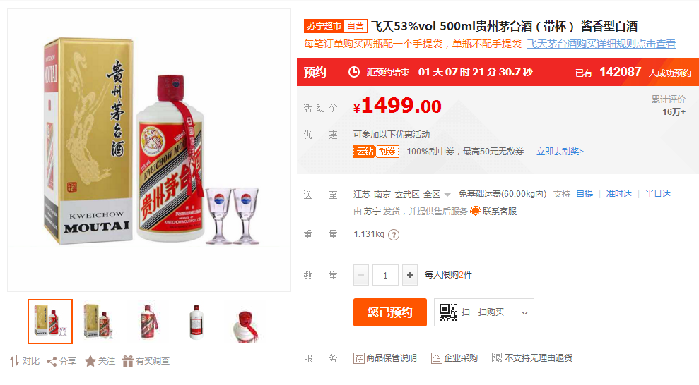 買年貨上蘇寧,買好酒上蘇寧。要說年貨節(jié)期間,蘇寧超市酒水類目的明星產(chǎn)品,還要屬1499元的飛天茅臺酒。年貨節(jié)期間,蘇寧已經(jīng)啟動了多輪的飛天茅臺酒的預(yù)約搶購,而1月10日即將迎來新一輪的搶購。截至1月8日上午10點(diǎn)多,已經(jīng)有超過14萬實(shí)名認(rèn)證super會員參與了本次預(yù)約。