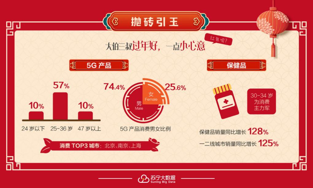 要說(shuō)2019年末人們討論最多的關(guān)鍵詞有哪些,5G一定是其中一個(gè)。除了保健品,5G產(chǎn)品成了人們的春節(jié)消費(fèi)新寵,報(bào)告顯示,5G產(chǎn)品銷量最好的三個(gè)城市分別為北京、南京、上海,消費(fèi)者年齡主要集中在25-36歲之間,占比總體的57%。有趣的是,24歲以下的年輕人和47歲以上中老年人,占比均在10%左右??磥?lái)年輕人回家過(guò)年也不忘把“潮流單品”帶給父母一輩。