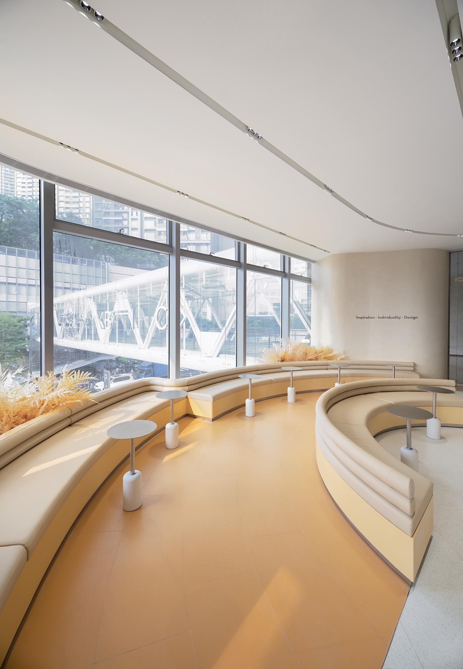 走進(jìn)喜茶深圳壹方天地C區(qū)店,通透的全落地玻璃外立面,讓藍(lán)天白云似乎觸手可及;渾然一體的圓潤吧臺(tái),讓整個(gè)空間更為純粹;橙白漸變的門店主色調(diào),為深圳增添了一份溫柔的秋意。門店整體布局采用了圍合式布局,圍繞中心的水吧,從外立面到客區(qū)桌椅的布置都以圓弧形態(tài)進(jìn)行圍合,隨性且愜意。