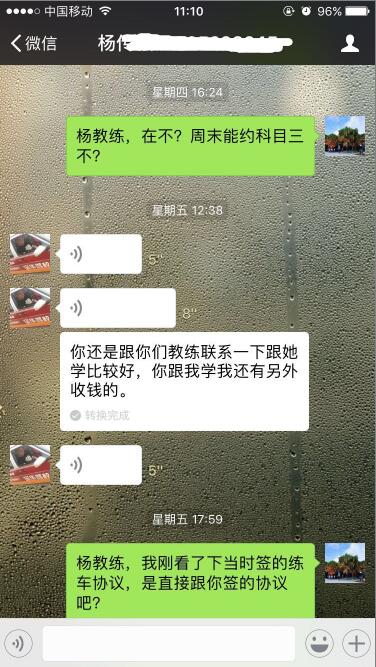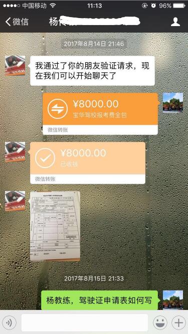 2017年8月,陳先生與寶華駕校教練員楊某銀簽《駕駛員培訓(xùn)合同》,并支付了全款培訓(xùn)費(fèi)用8000元(見微信截圖)。2018年1月,陳先生通過科目二考試后,與楊某預(yù)約科目三考試。楊某提出要再次收費(fèi)(詳見聊天記錄)。陳先生與楊某溝通無(wú)效后,向該教練掛靠的寶華駕校投訴維權(quán),寶華駕校反應(yīng)“其一,駕校不接收學(xué)員不與學(xué)員簽合同;其二,教練的投訴先調(diào)查了解”,后續(xù)再無(wú)反饋。