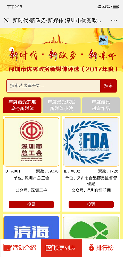 ② 多個(gè)投票活動(dòng)已經(jīng)形成良好群眾效應(yīng),合作方主辦方多屆舉辦,每屆舉辦均由深圳新聞網(wǎng)負(fù)責(zé)投票系統(tǒng)開發(fā),例如:健康場(chǎng)所投票、集團(tuán)攝影大賽評(píng)選投票、政務(wù)類投票。形成了良好品牌效應(yīng)和示范,往往一個(gè)區(qū)舉辦的投票活動(dòng)其他區(qū)會(huì)跟進(jìn)舉辦,形成系列投票,例如:“最美護(hù)士”系列投票,“最美醫(yī)生”系列投票,“最美教師”系列投票,“最佳政務(wù)”系列投票等;
