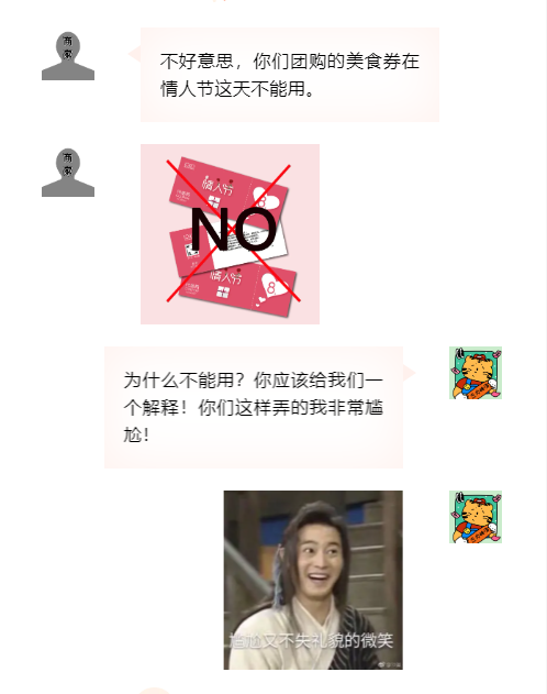 遇到春節(jié)、情人節(jié)等特殊時期,消費者在團購時應(yīng)當看清使用期限,如商家未提前說明美食券的限用日期,而是去到現(xiàn)場才告知消費者不能使用,則商家涉嫌侵害消費者的知情權(quán)、公平交易權(quán)。如商家銷售美食券的頁面,注明情人節(jié)不能使用,此時商家盡到了提醒義務(wù),消費者可在規(guī)定的其他時間內(nèi)使用美食券,或者向平臺申請退款。(消費提示:消費者購買團購券時,要仔細閱讀團購頁面的使用說明,特別是要仔細瀏覽團購券使用時限。限用人數(shù)等具體內(nèi)容,避免遭遇買了卻用不了的困境。)