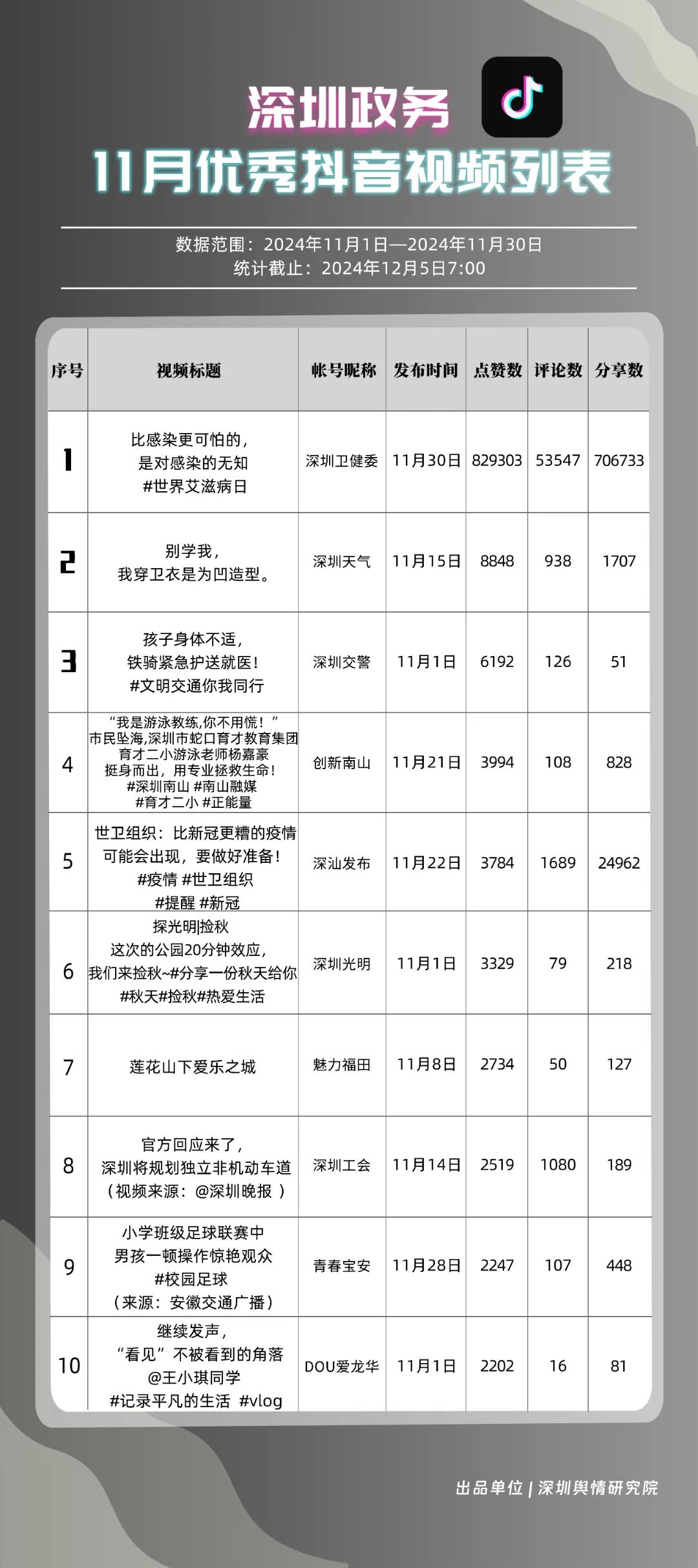 11月,“深圳衛(wèi)健委”“掌上龍崗”“深圳天氣”“深汕發(fā)布”“深圳工會”“深圳交警”“創(chuàng)新南山”“DOU愛龍華”“深圳光明”“中國前海”共10個政務(wù)抖音號獲得“深圳優(yōu)秀政務(wù)抖音號”稱號?!吧钲谛l(wèi)健委”憑借高質(zhì)量劇情內(nèi)容,巧妙融入健康知識,視頻累計收獲近百萬點贊。同時,“掌上龍崗”和“深圳天氣”也在視頻內(nèi)容創(chuàng)新上不斷探索,通過優(yōu)化宣傳策略和信息傳播方式,使得網(wǎng)民能夠在輕松愉快的氛圍中了解龍崗區(qū)的最新動態(tài)和深圳的天氣信息,展現(xiàn)了政務(wù)抖音號的獨特魅力與社會影響力。