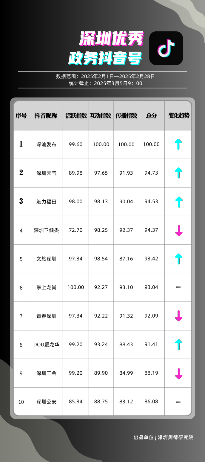 2月,“深汕發(fā)布”“深圳天氣”“魅力福田”“深圳衛(wèi)健委”“文旅深圳”“掌上龍崗”“青春深圳”“DOU愛(ài)龍華”“深圳工會(huì)”“深圳公安”共10個(gè)政務(wù)抖音號(hào)獲得“深圳優(yōu)秀政務(wù)抖音號(hào)”稱(chēng)號(hào)。“深汕發(fā)布”位于榜單第一名,值得關(guān)注的是,該賬號(hào)2月作品總分享數(shù)超20萬(wàn)次,其中有關(guān)“華南地區(qū)回南天”的視頻單條分享量達(dá)到19萬(wàn)次以上,展現(xiàn)出強(qiáng)勁的傳播力?!吧钲谔鞖狻薄镑攘ΩL铩薄吧钲谛l(wèi)健委”三賬號(hào)堅(jiān)持輸出優(yōu)質(zhì)內(nèi)容,得分均在94分以上,展現(xiàn)出深圳政務(wù)新媒體賬號(hào)在短視頻傳播領(lǐng)域的創(chuàng)新活力。