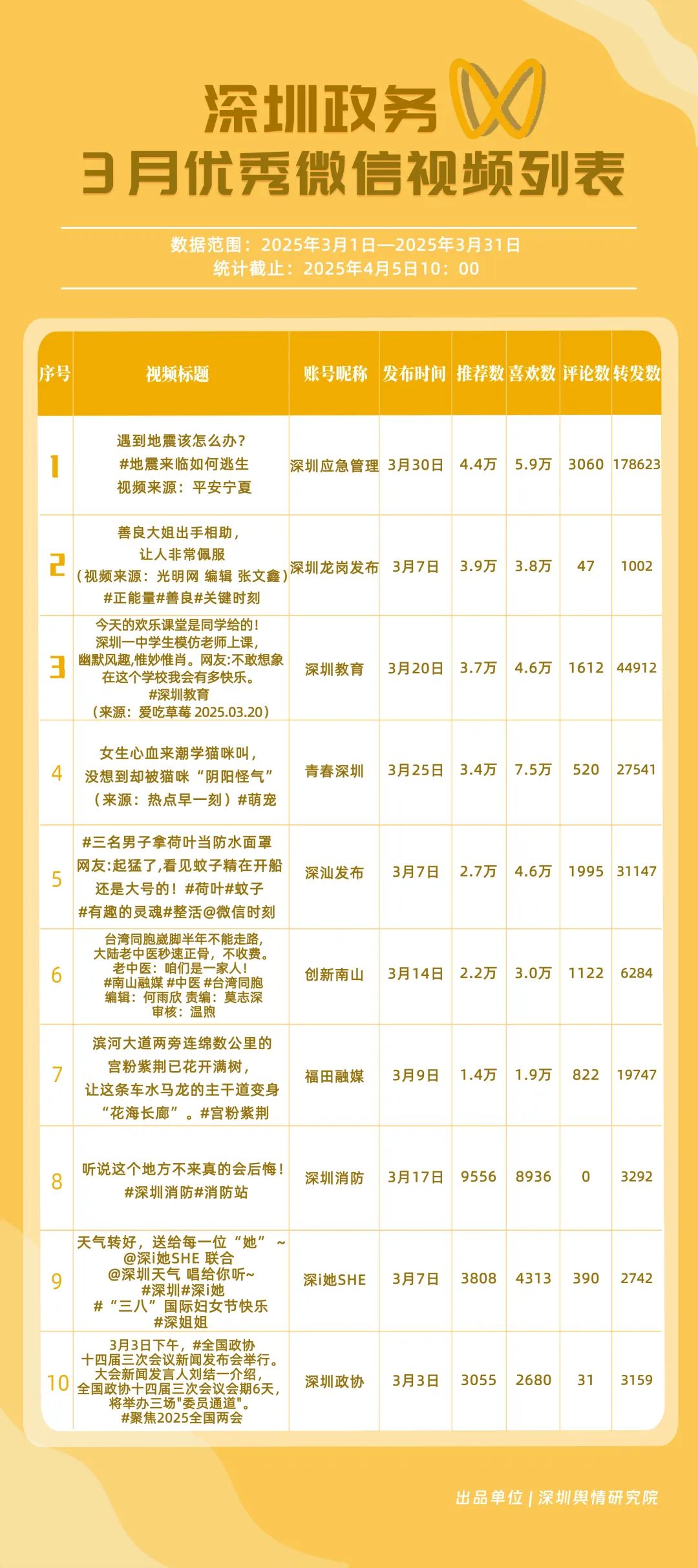 3月,獲“深圳優(yōu)秀政務(wù)微信視頻號”稱號的分別是“深圳應(yīng)急管理”“深圳教育”“深汕發(fā)布”“青春深圳”“創(chuàng)新南山”“福田融媒”“深圳龍崗發(fā)布”“深圳光明”“文旅深圳”“深圳天氣”。其中,“深圳應(yīng)急管理”以20余篇作品收獲超20萬次轉(zhuǎn)發(fā),躍居第一名,一期有關(guān)“地震來臨如何逃生”的視頻收獲超17萬次轉(zhuǎn)發(fā),展現(xiàn)了其內(nèi)容的高實用性?!吧钲诮逃薄吧钌前l(fā)布”位于榜單第二、三位,總分超90分,反映出兩賬號在民生教育、區(qū)域宣傳領(lǐng)域擁有較好傳播效果?!扒啻荷钲凇薄皠?chuàng)新南山”“福田融媒”等賬號也在3月發(fā)布優(yōu)質(zhì)視頻內(nèi)容,展現(xiàn)了深圳政務(wù)新媒體在視頻號平臺宣傳的創(chuàng)新探索。