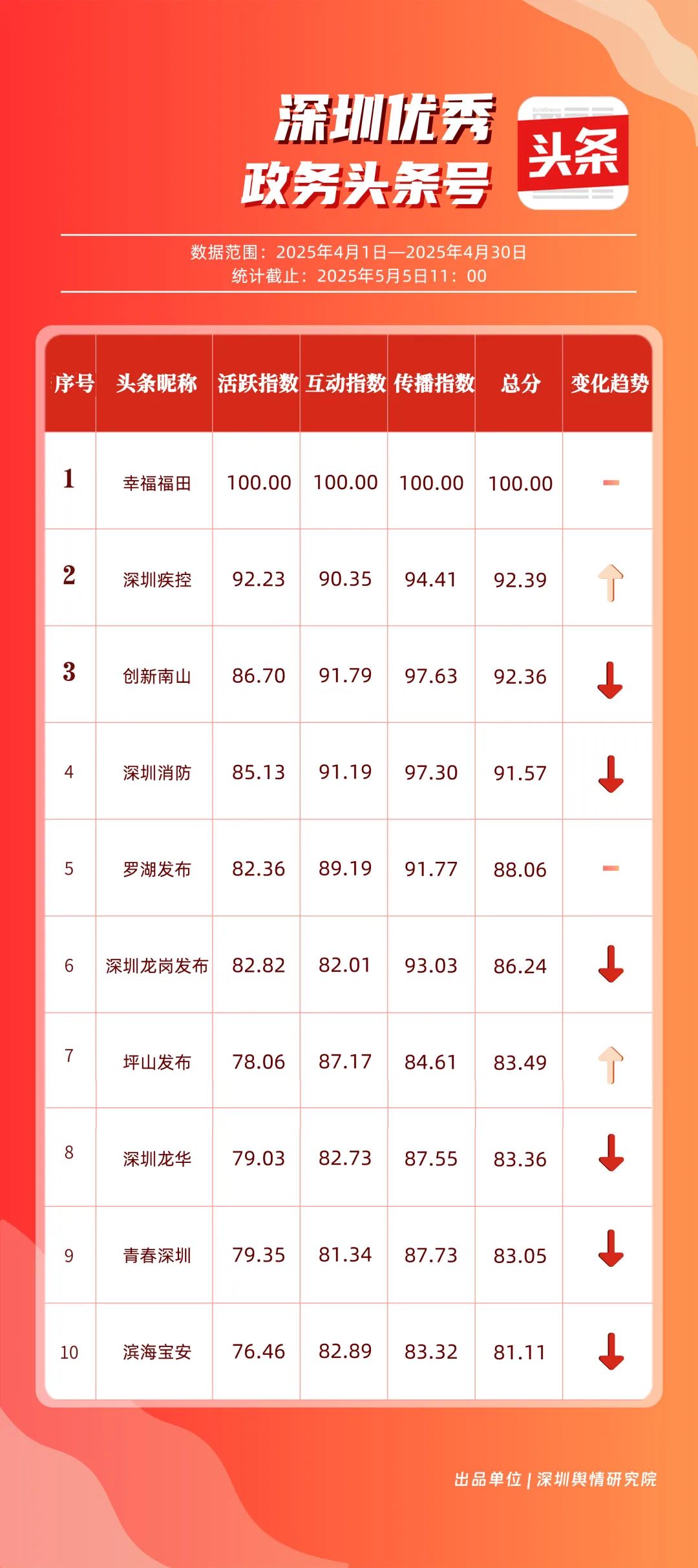 4月,“幸福福田”“深圳疾控”“創(chuàng)新南山”“深圳消防”“羅湖發(fā)布”“深圳龍崗發(fā)布”“坪山發(fā)布”“深圳龍華”“青春深圳”“濱海寶安”共10個政務(wù)頭條號入選“優(yōu)秀政務(wù)頭條號”榜單。“幸福福田”延續(xù)上月的優(yōu)異表現(xiàn),以優(yōu)質(zhì)的內(nèi)容輸出和穩(wěn)定的用戶互動,位列榜單首位,成為政務(wù)頭條號的標桿;“深圳疾控”則以92.39分的亮眼成績排在榜單第二位,凸顯了政務(wù)新媒體在公共衛(wèi)生領(lǐng)域的傳播成果;“創(chuàng)新南山”“深圳消防”“羅湖發(fā)布”緊隨其后,分別在城區(qū)形象宣傳、消防安全領(lǐng)域等方面深耕細作,持續(xù)擴大政務(wù)信息的覆蓋面與影響力。