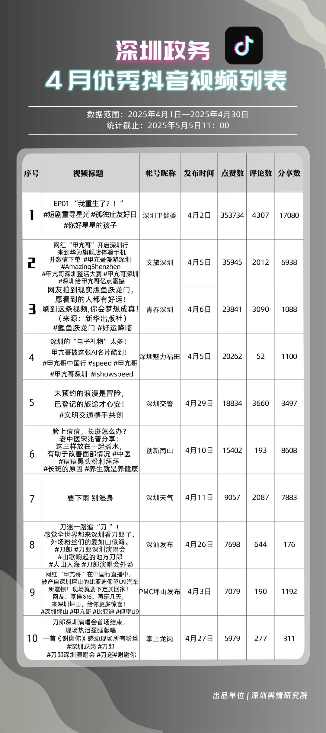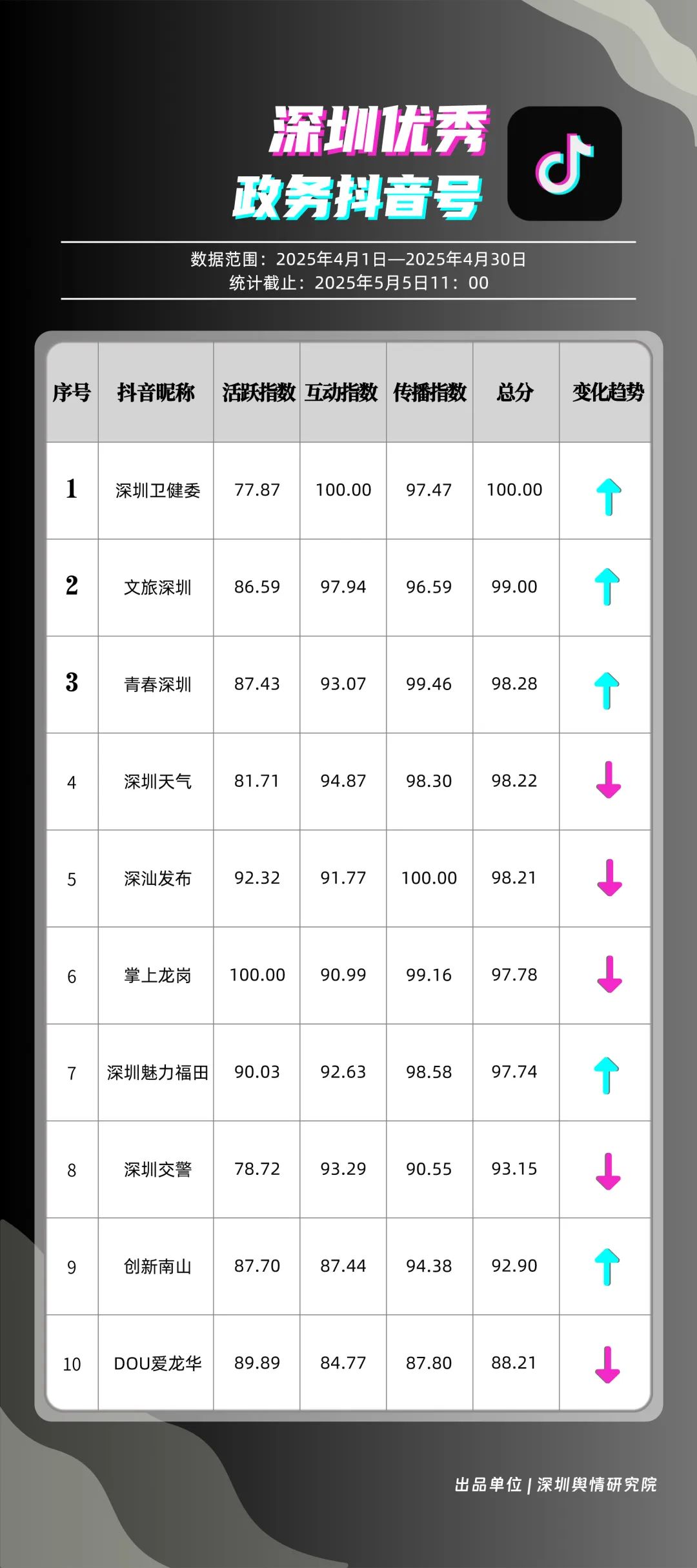 4月,“深圳衛(wèi)健委”“文旅深圳”“青春深圳”“深圳天氣”“深汕發(fā)布”“掌上龍崗”“深圳魅力福田”“深圳交警”“創(chuàng)新南山”“DOU愛龍華”共10個政務(wù)抖音號獲得“優(yōu)秀政務(wù)抖音號”稱號。4月,“深圳衛(wèi)健委”“文旅深圳”“青春深圳”憑借新穎的內(nèi)容策劃、生動的短視頻呈現(xiàn)方式,實現(xiàn)排名提升,位居榜單前三。“深圳天氣”“深汕發(fā)布”緊隨其后,以優(yōu)質(zhì)實用的內(nèi)容、接地氣的表達,持續(xù)擴大政務(wù)新媒體的傳播聲量。上榜賬號積極探索創(chuàng)新傳播路徑,以生動有趣的方式傳遞政務(wù)信息,為深圳政務(wù)新媒體在短視頻領(lǐng)域的發(fā)展注入新活力。