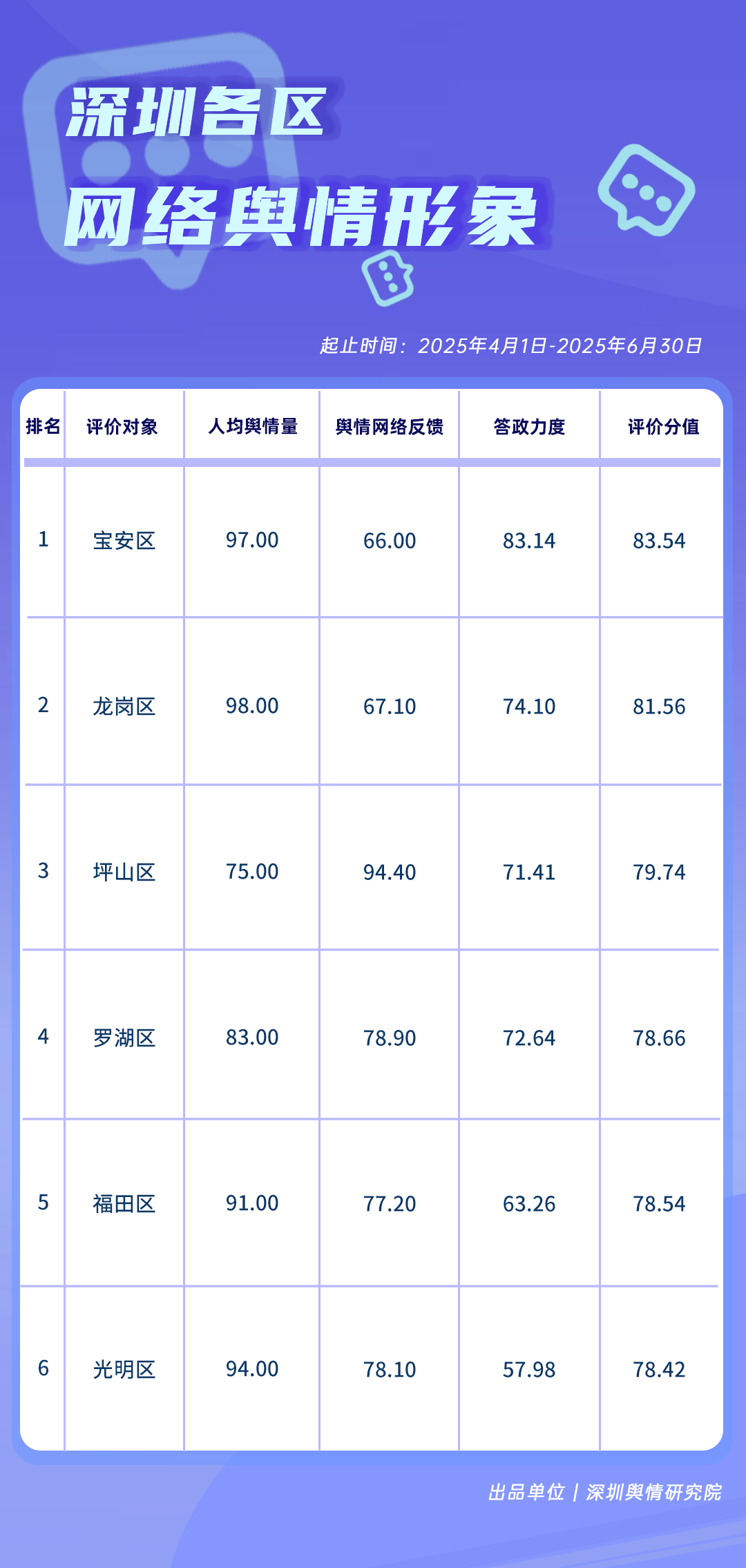 4-6月,在網(wǎng)絡(luò)輿情方面,寶安區(qū)、龍崗區(qū)憑借較低的人均輿情量、較好的答政效果,位居榜單前二;坪山區(qū)、羅湖區(qū)、福田區(qū)、光明區(qū)也躋身前列,以優(yōu)異分數(shù)展現(xiàn)其在網(wǎng)絡(luò)輿情工作中的積極成效,彰顯了各區(qū)在營造良好網(wǎng)絡(luò)輿情環(huán)境、及時回應(yīng)網(wǎng)民訴求上的主動擔(dān)當。