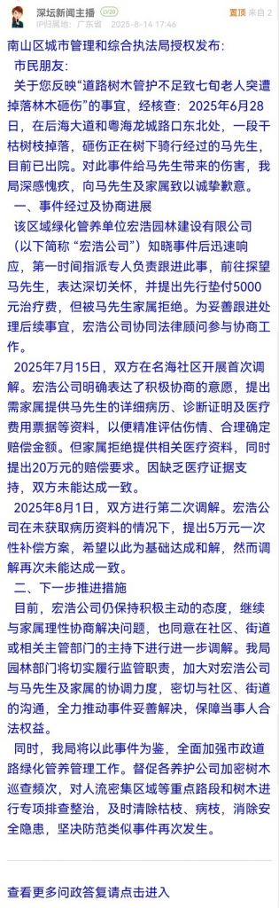 關(guān)于您反映“道路樹木管護(hù)不足致七旬老人突遭掉落林木砸傷”的事宜,經(jīng)核查:2025年6月28日,在后海大道和粵海龍城路口東北處,一段干枯樹枝掉落,砸傷正在樹下騎行經(jīng)過的馬先生,目前已出院。對此事件給馬先生帶來的傷害,我局深感愧疚,向馬先生及家屬致以誠摯歉意。