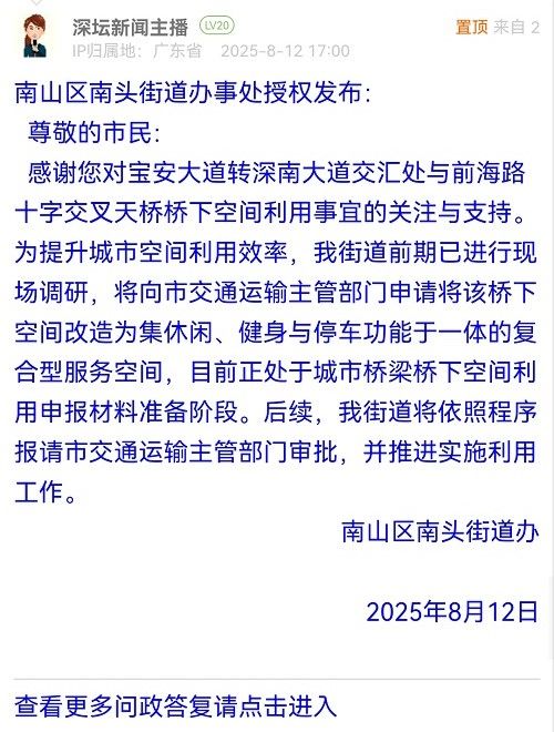 感謝您對寶安大道轉(zhuǎn)深南大道交匯處與前海路十字交叉天橋橋下空間利用事宜的關(guān)注與支持。為提升城市空間利用效率,我街道前期已進(jìn)行現(xiàn)場調(diào)研,將向市交通運(yùn)輸主管部門申請將該橋下空間改造為集休閑、健身與停車功能于一體的復(fù)合型服務(wù)空間,目前正處于城市橋梁橋下空間利用申報材料準(zhǔn)備階段。后續(xù),我街道將依照程序報請市交通運(yùn)輸主管部門審批,并推進(jìn)實(shí)施利用工作。