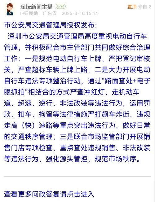 深圳市公安局交通管理局高度重視電動自行車管理,并積極配合市主管部門共同做好綜合治理工作:一是規(guī)范電動自行車上牌,嚴(yán)把登記審核關(guān),嚴(yán)查超標(biāo)車輛上牌上路;二是大力開展電動自行車違法專項整治行動,通過“路面查處+電子眼抓拍”相結(jié)合的方式嚴(yán)查沖紅燈、走機(jī)動車道、超速、逆行、非法改裝等違法行為,運(yùn)用罰款、扣車、拘留等法律措施嚴(yán)打飆車炸街、違規(guī)走高(快)速路等重點(diǎn)突出違法行為,做好日常的交通秩序管理;三是聯(lián)合市場監(jiān)管部門開展銷售門店專項檢查,重點(diǎn)查處違規(guī)銷售、非法改裝等違法行為,強(qiáng)化源頭管控,規(guī)范市場秩序。