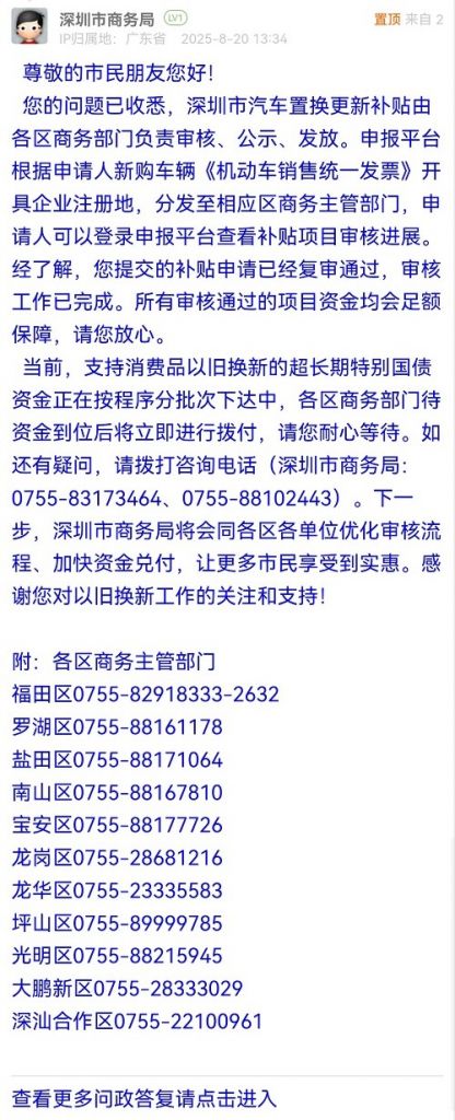 您的問題已收悉,深圳市汽車置換更新補(bǔ)貼由各區(qū)商務(wù)部門負(fù)責(zé)審核、公示、發(fā)放。申報平臺根據(jù)申請人新購車輛《機(jī)動車銷售統(tǒng)一發(fā)票》開具企業(yè)注冊地,分發(fā)至相應(yīng)區(qū)商務(wù)主管部門,申請人可以登錄申報平臺查看補(bǔ)貼項目審核進(jìn)展。經(jīng)了解,您提交的補(bǔ)貼申請已經(jīng)復(fù)審?fù)ㄟ^,審核工作已完成。所有審核通過的項目資金均會足額保障,請您放心。