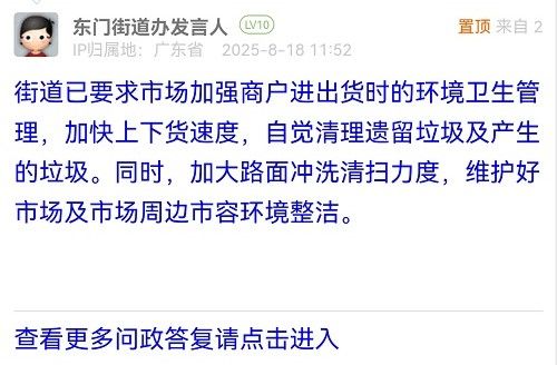 街道已要求市場加強(qiáng)商戶進(jìn)出貨時的環(huán)境衛(wèi)生管理,加快上下貨速度,自覺清理遺留垃圾及產(chǎn)生的垃圾。同時,加大路面沖洗清掃力度,維護(hù)好市場及市場周邊市容環(huán)境整潔。